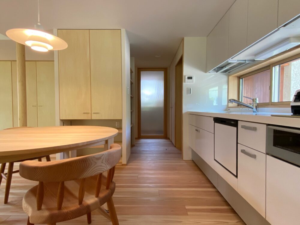 玄関、キッチン、リビング、ダイニング、廊下、様々なところで行き止まりを少なく、また柔らかな灯りと影を入れるための配置になっているのです。