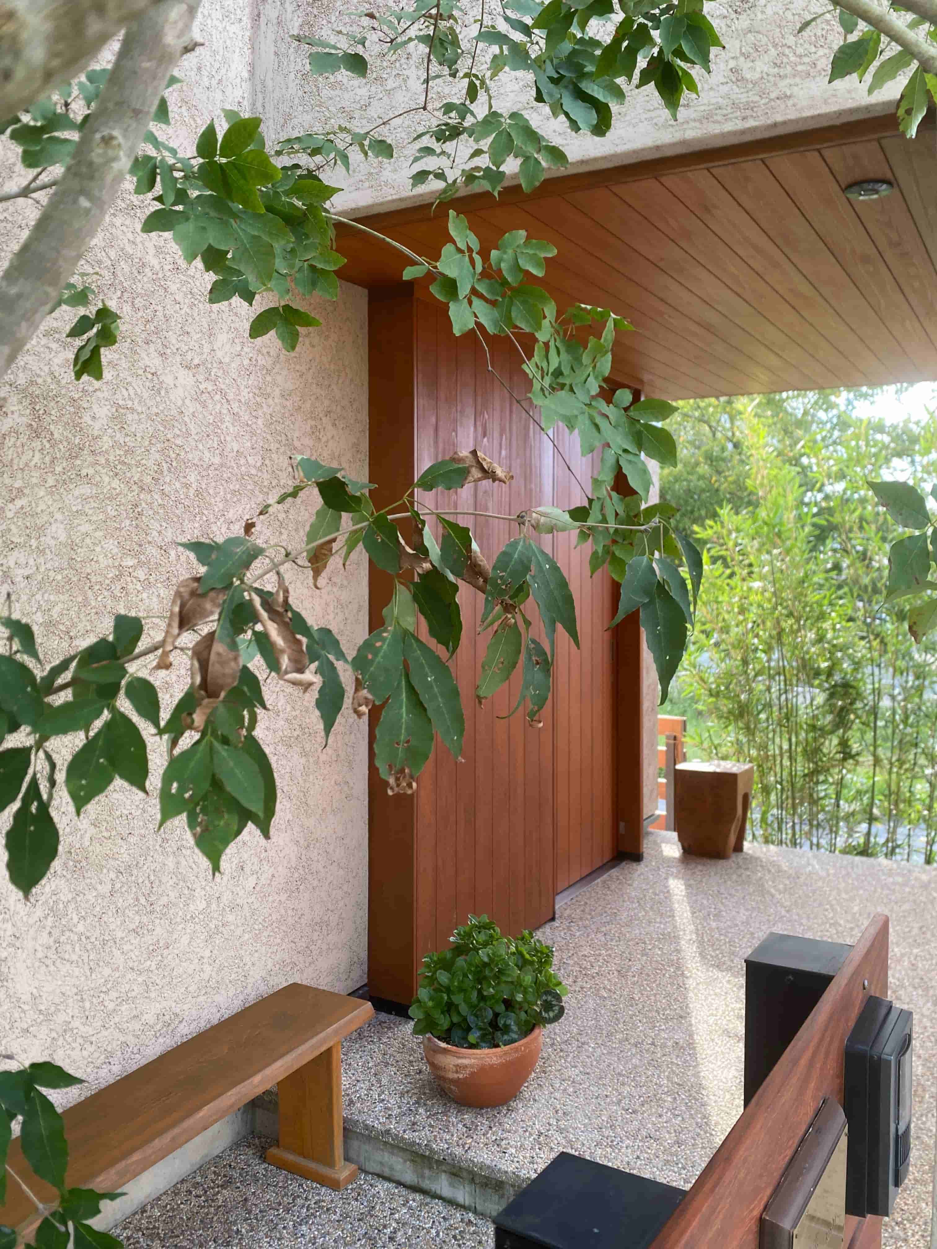 「玄関がどこから入るのかがわからないようなアプローチがいい」と語る建築家・伊礼智氏の設計思想に基づき、植栽や外物置が自然に玄関を包み込むように配置されています。