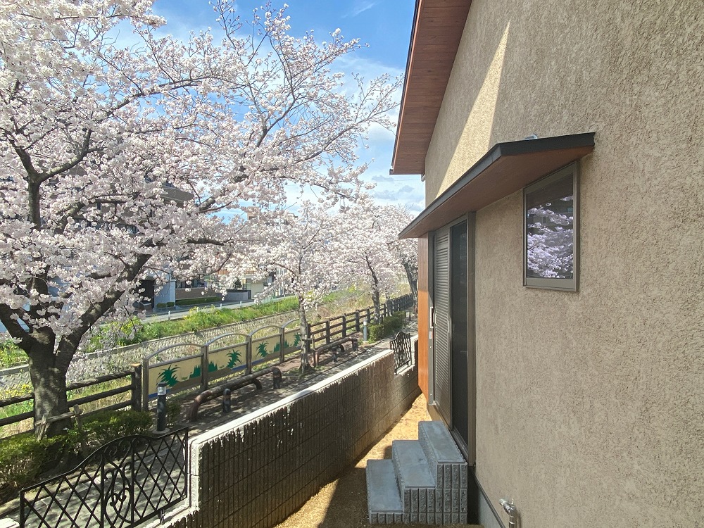 またもう一方の窓からも同じように桜と空が見え、この角度は外壁のそとん壁と製作の小庇も視界に入り、室内にいながら外観を楽しむこともできる場所になりました。