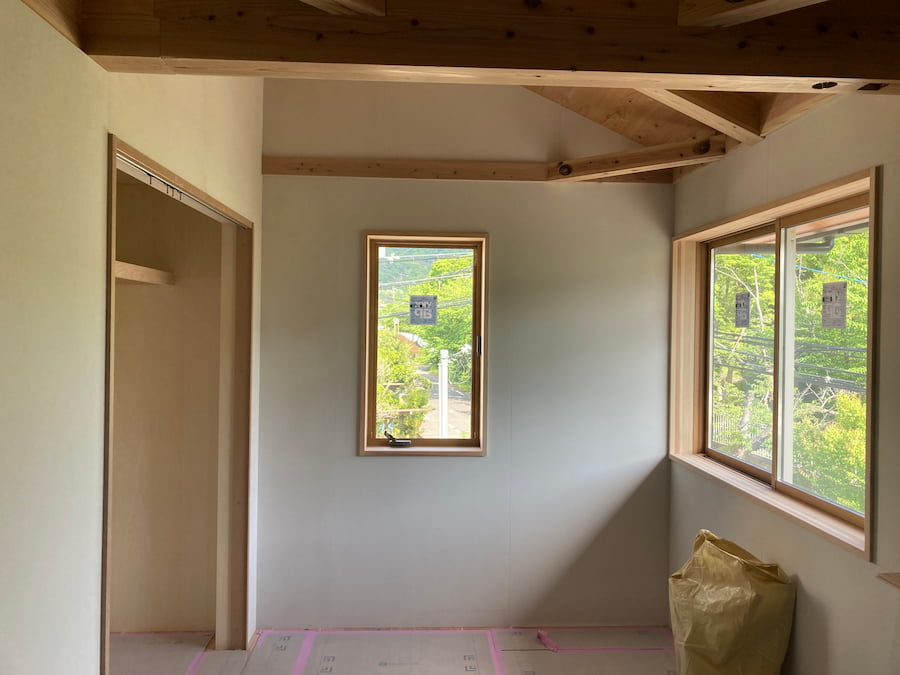 白い壁は「モイスNT」という天然素材からできた調湿建材。