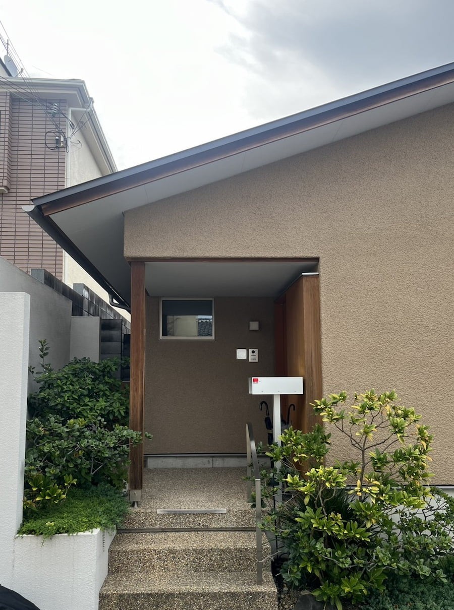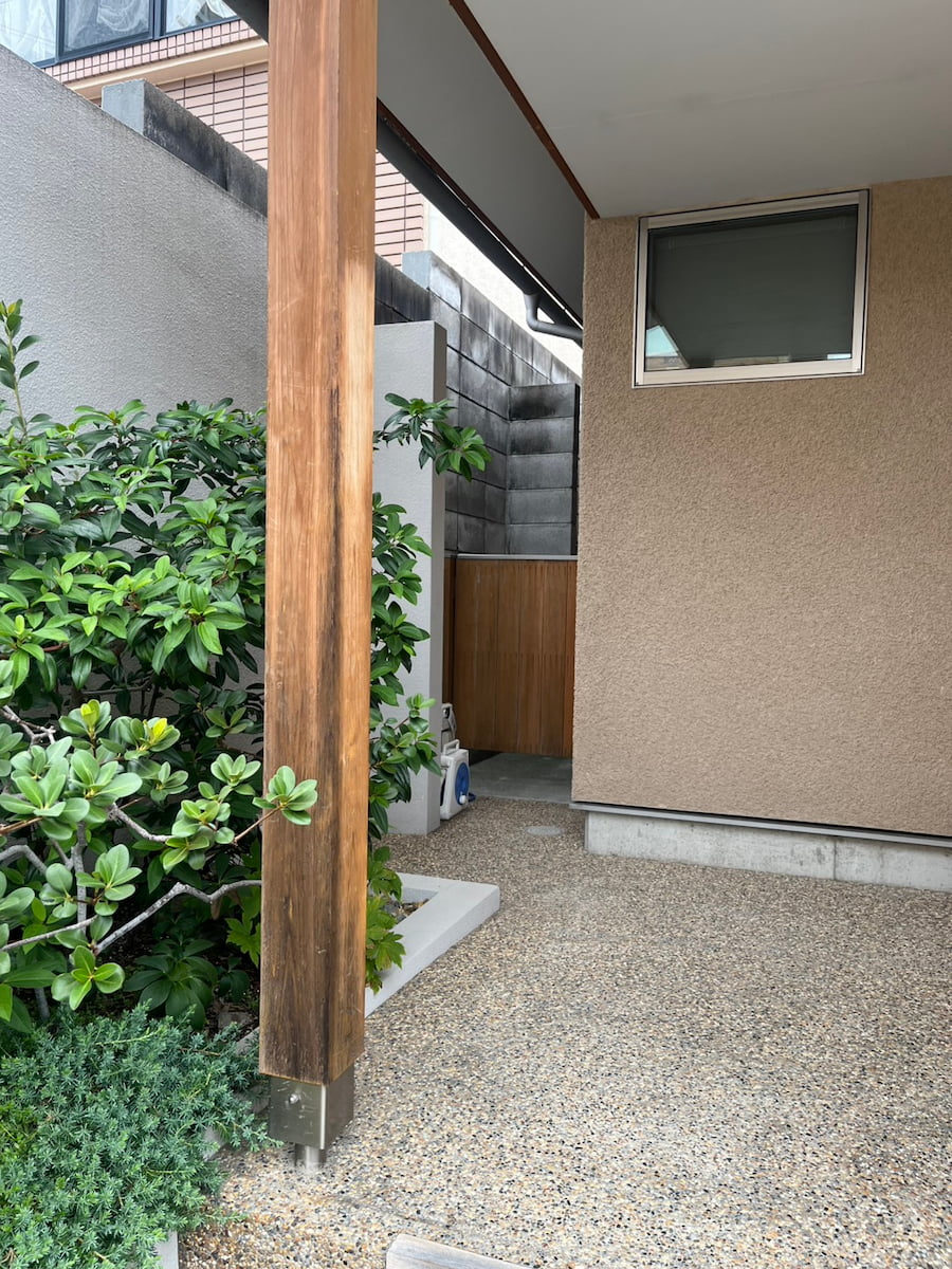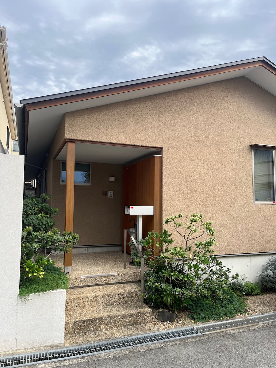 今回再塗装を行うのは、写真にみえる木部(玄関ドアとポーチ柱、屋根の破風板と鼻隠し)です。