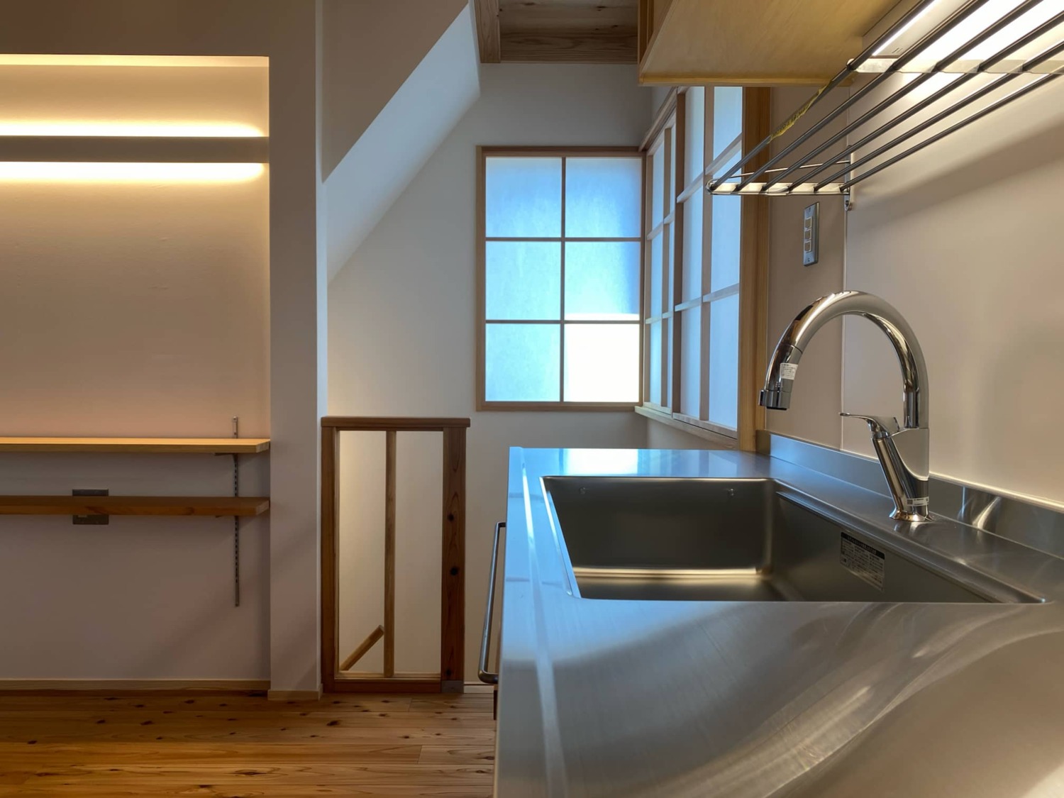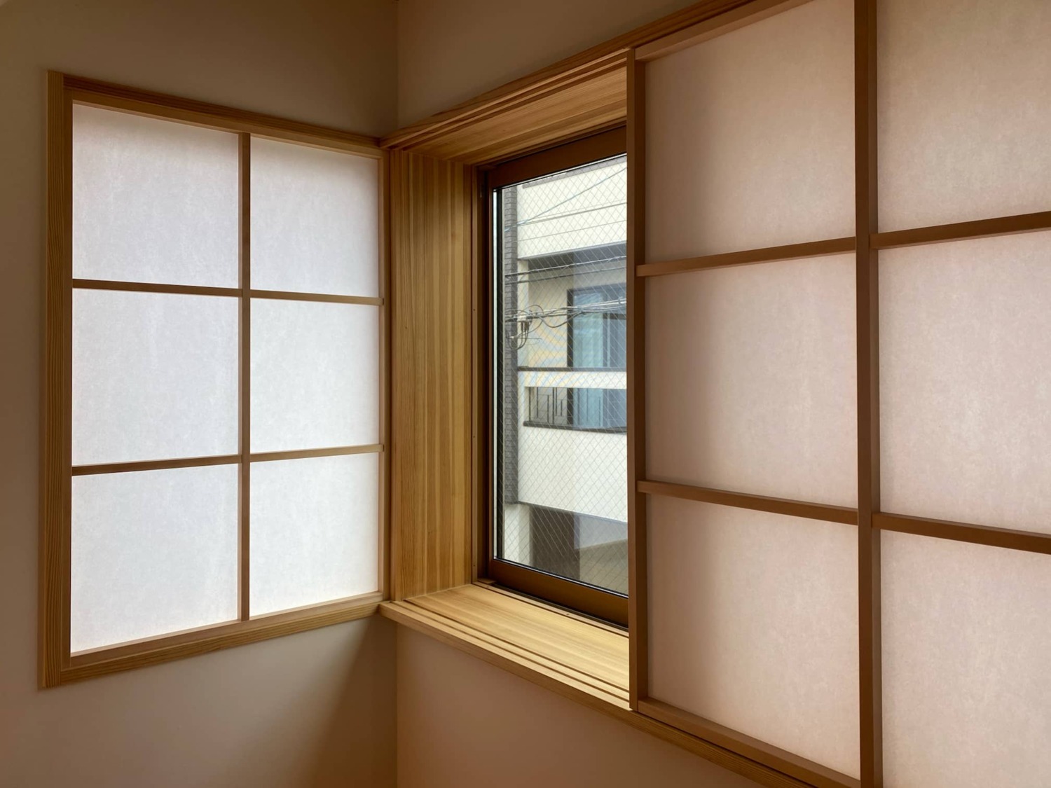 住宅密集地のため、視線を気にせずに明るさの確保をしたいと内障子を希望しました。階段付近のL型に繋がる連窓部分は建具の取合いが難しい箇所でしたが、古田大工さんの超絶テクニックですっきりと納めて頂きました。