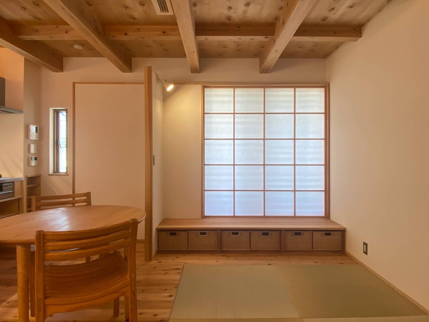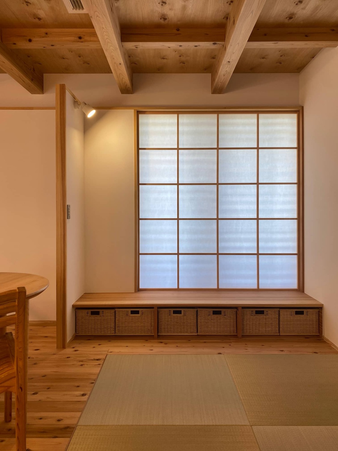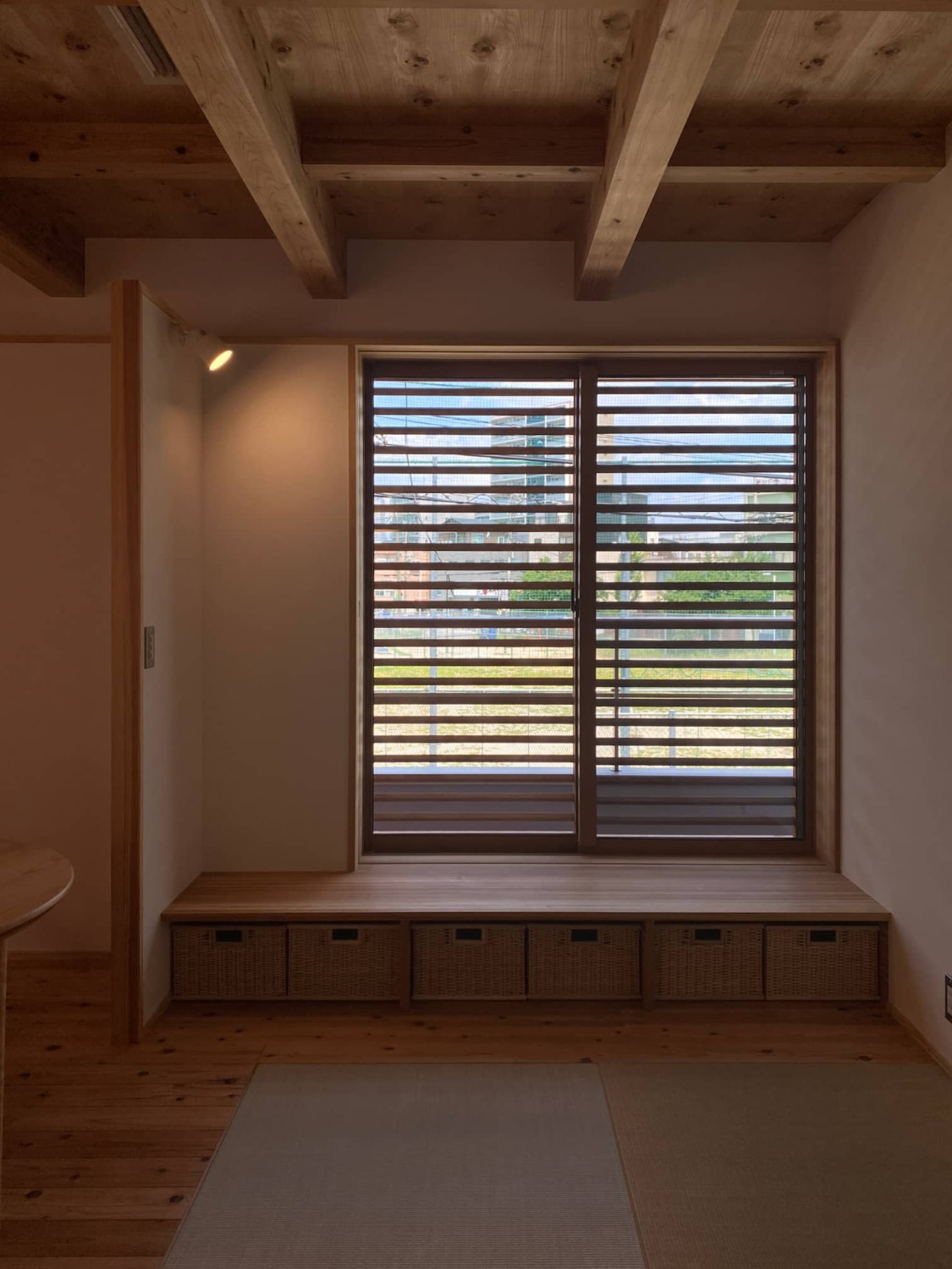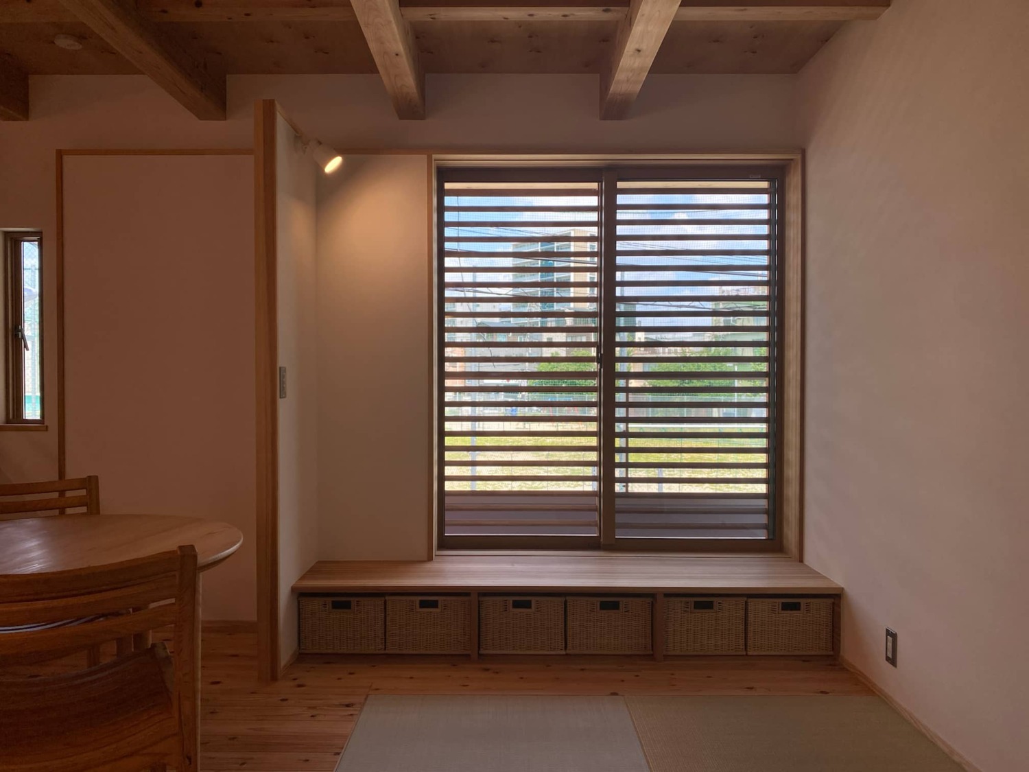 遠いですが向かいの公園の桜の木も眺められるので、ここだけは網入防火ガラスではなく透明の防火ガラスに。収納スペースを兼ねた小上がりも設けたので、休みの日はここでまったりコーヒーを飲んだりしたいと思います。