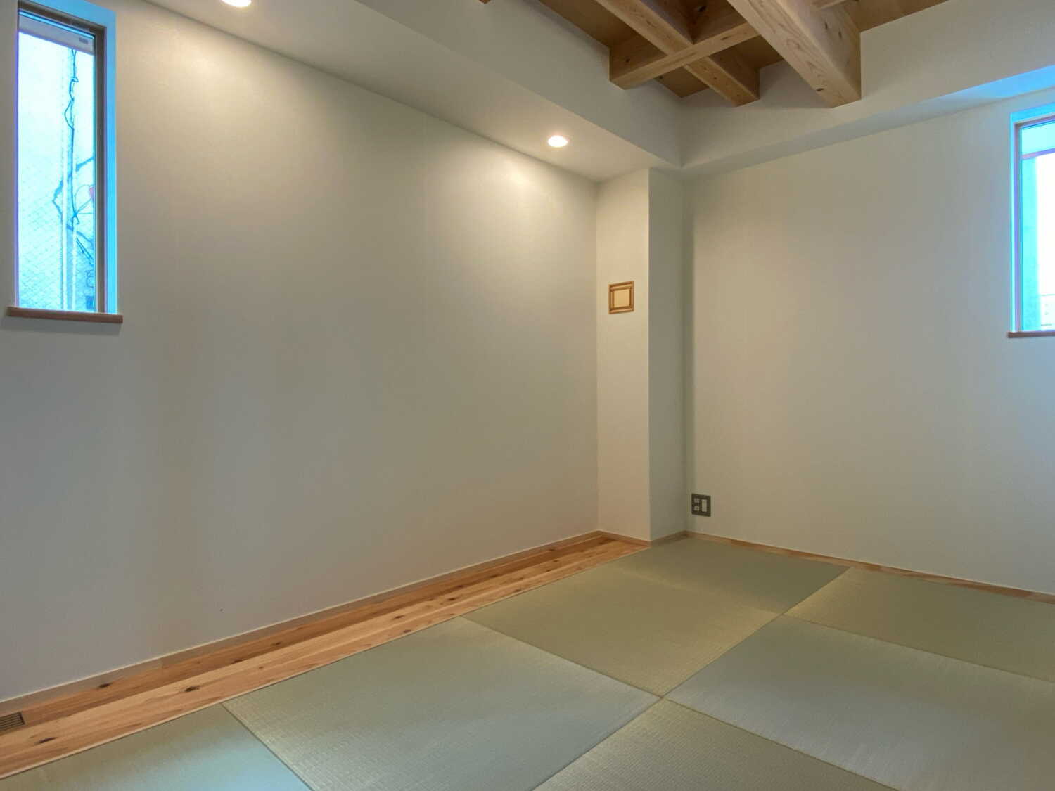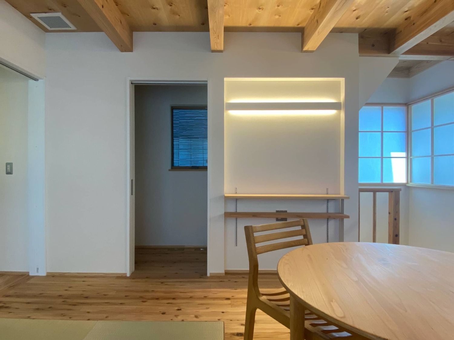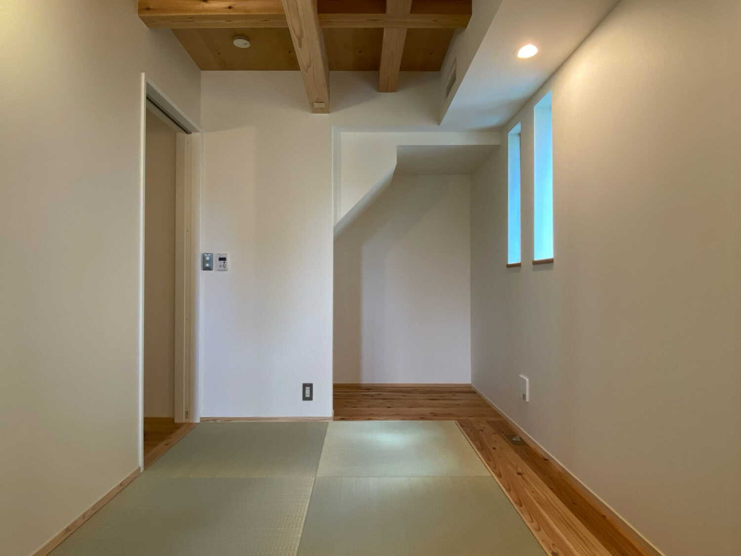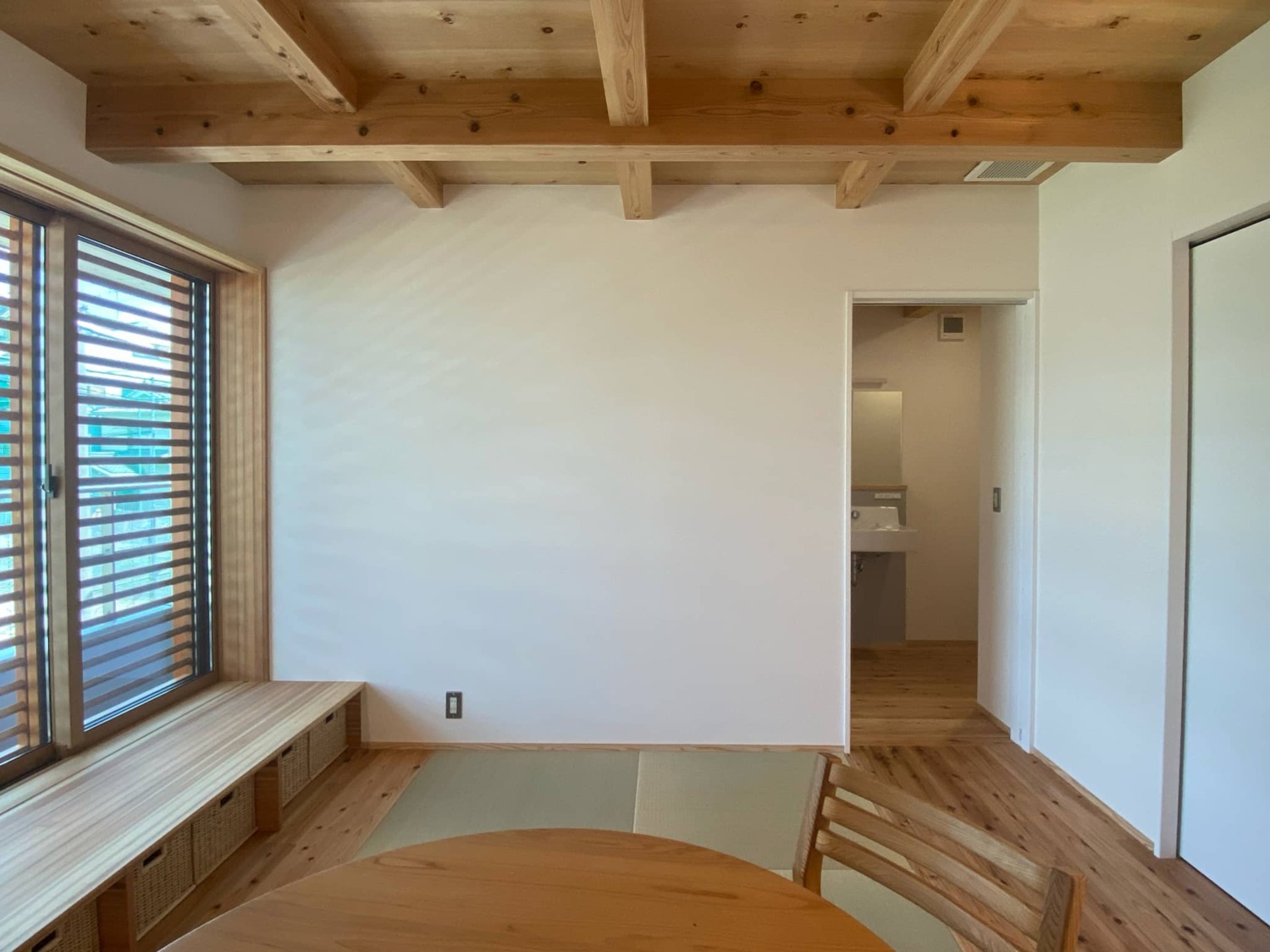 トイレもそばにある、1階畳寝室、天井は無垢の現しに