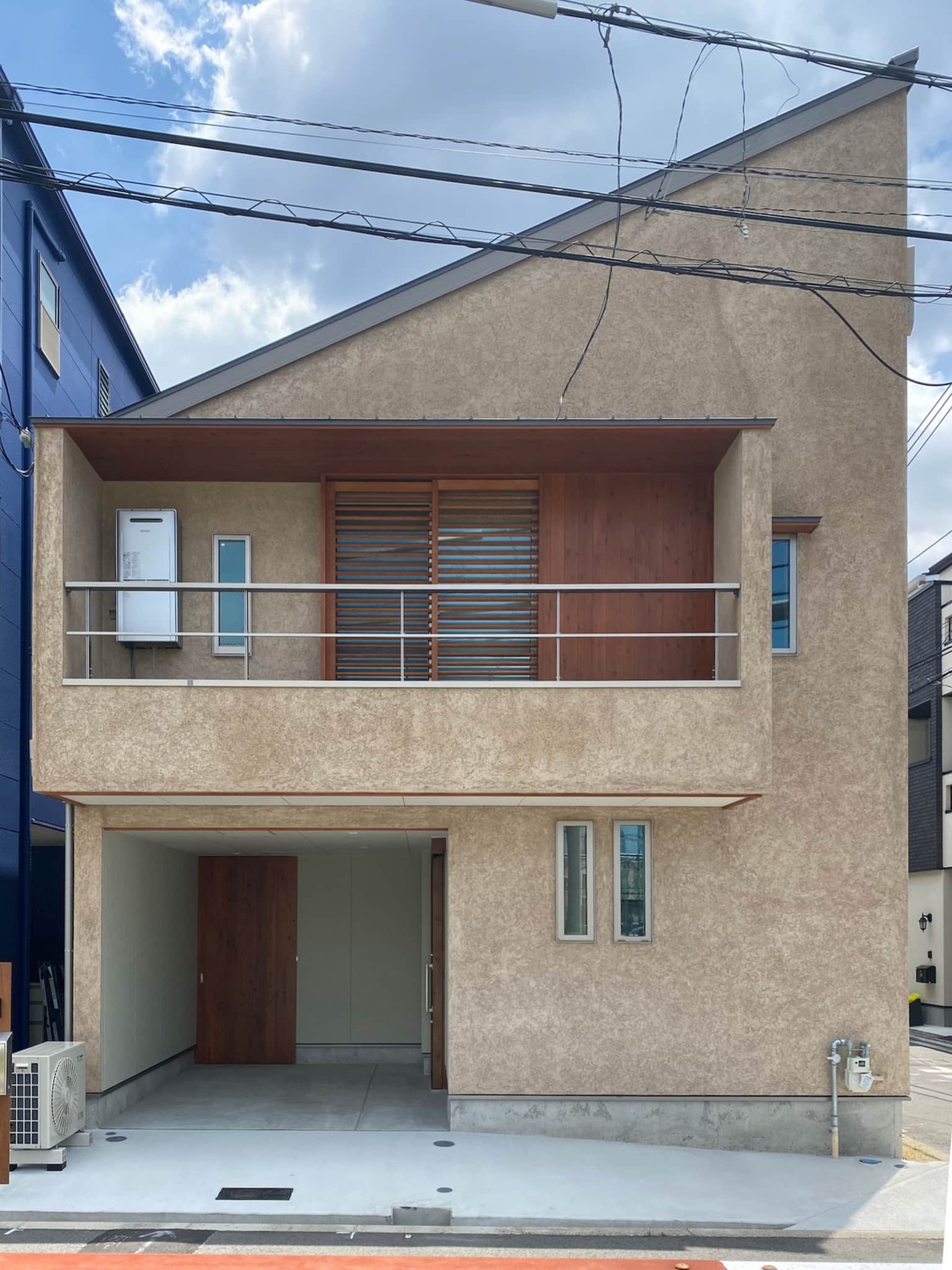 狭小地の中にも「陽の木の家」定番のそとん壁、木を外に使う工夫を凝らした