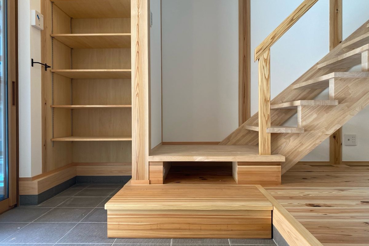 玄関が広々しているため荷物の出し入れ、靴の脱ぎ履き、雨具など、気持ちにもゆとりができるようになります。